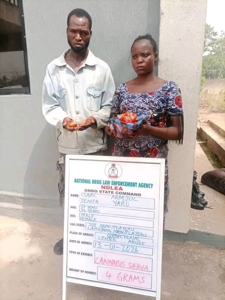 Officers at the Medium Security Custodial Centre in Akure, Ondo State, thwarted a brazen attempt to smuggle Indian hemp into the facility on January 13, 2026.​ Two visitors, Isaac Nimjul from Langtang North and Jennifer Yaro from Jos South in Plateau State, arrived pretending to carry fresh tomatoes for an inmate but were caught after a routine search exposed the contraband.​