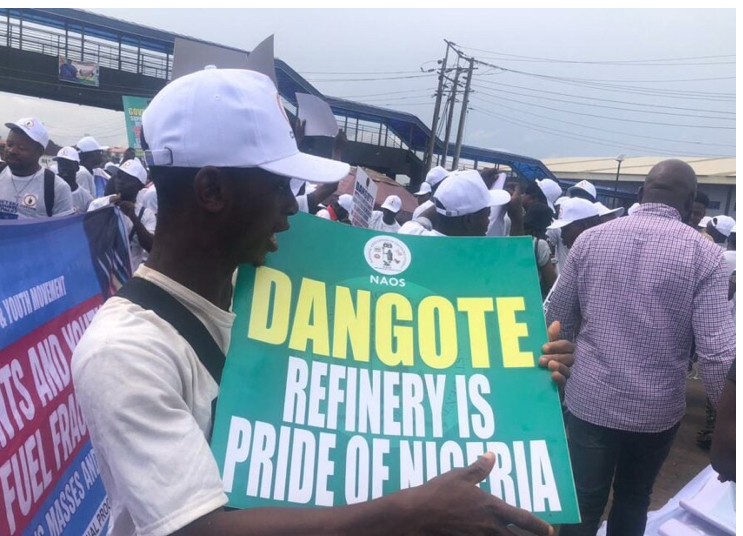 They are marching through major routes, waving placards with inscriptions such as, “Don’t Kill Dangote Refinery,” “#StopsabotagingfuelinNigwria“#EndPENGASSAN,” #EndDAPPMAN,” “#DangoteRefineryIsANationalAsset,” “#StopSabotage, among others.”
