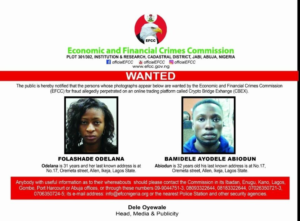 The notice read, “The public is hereby notified that the persons whose photographs appear below are wanted by the Economic and Financial Crimes Commission (EFCC) for fraud allegedly perpetrated on an online trading platform called Crypto Bridge Exchange (CBEX). FOLASHADE ODELANA. Odelana is 31 years old and her last known address is at No. 17, Oremeta Street, Allen, Ikeja, Lagos State.