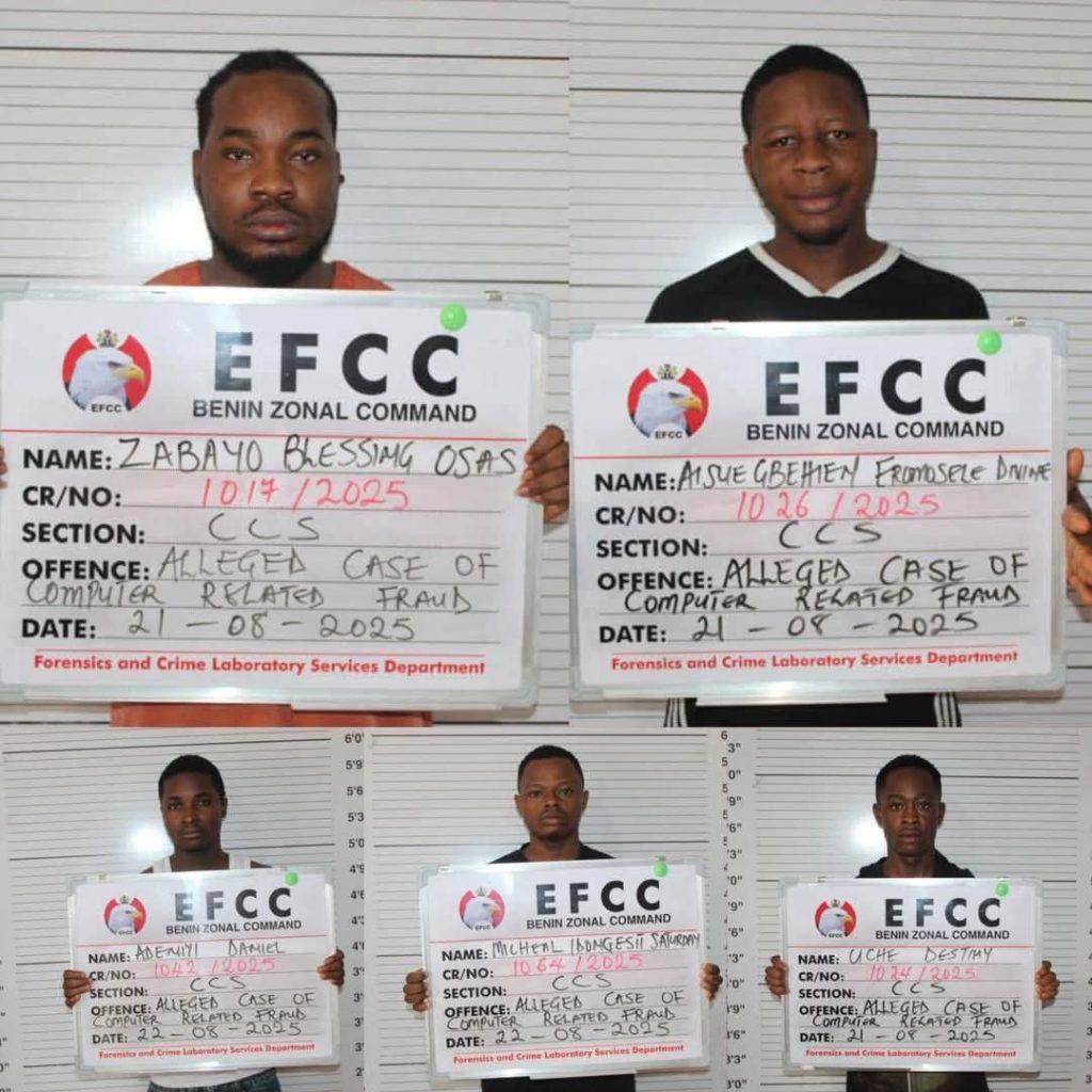 Blessing Osakporlor Zabayo, Divine Eromosele Aisuegbehien, Daniel Destiny Adeniyi, Uche Destiny and Saturday Michael Idongesit were on Wednesday, August 27, 2025 convicted and sentenced to various jail terms by Justice M. Itsueli of Edo State High Court, sitting in Benin City for fraud.