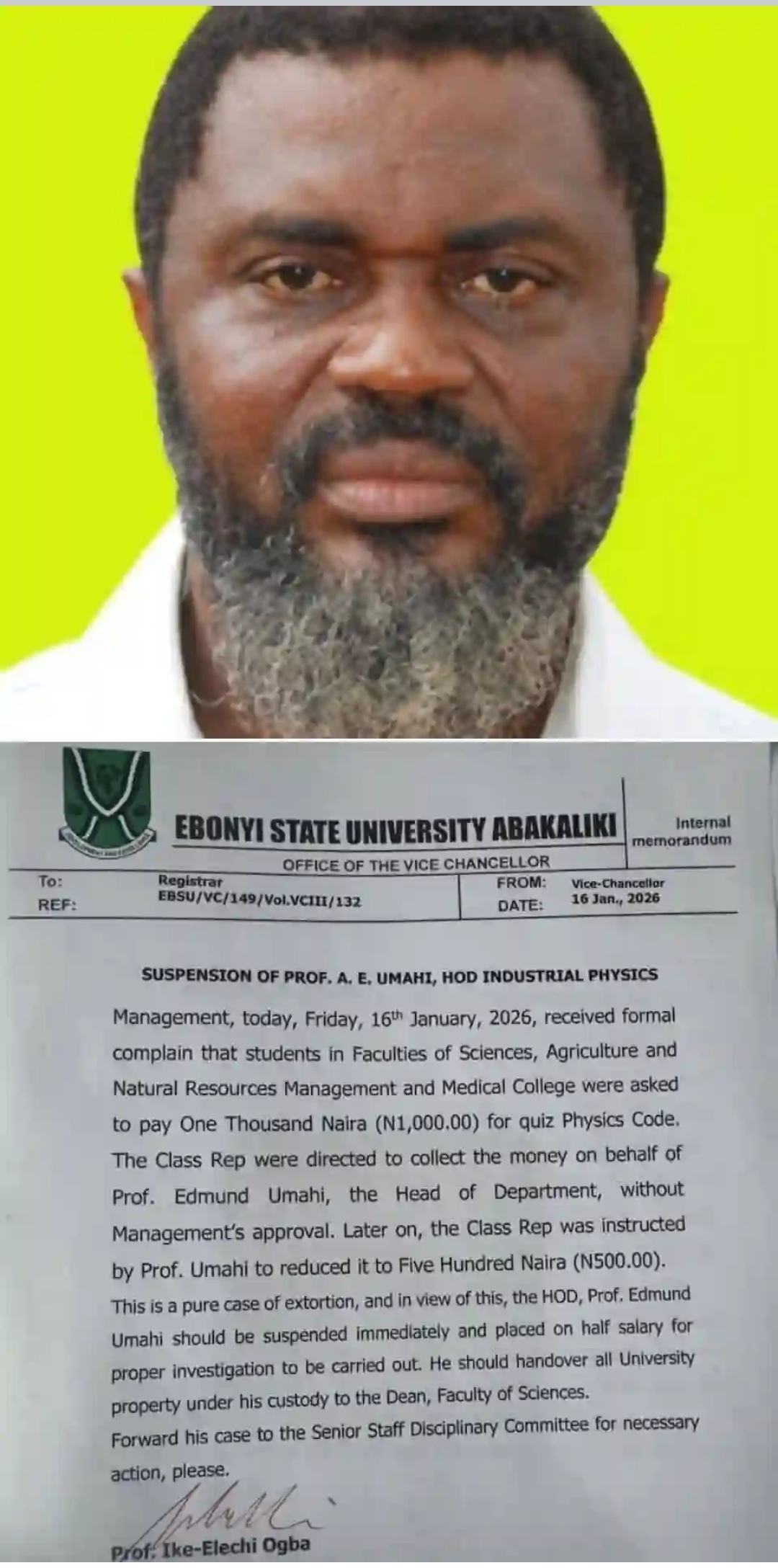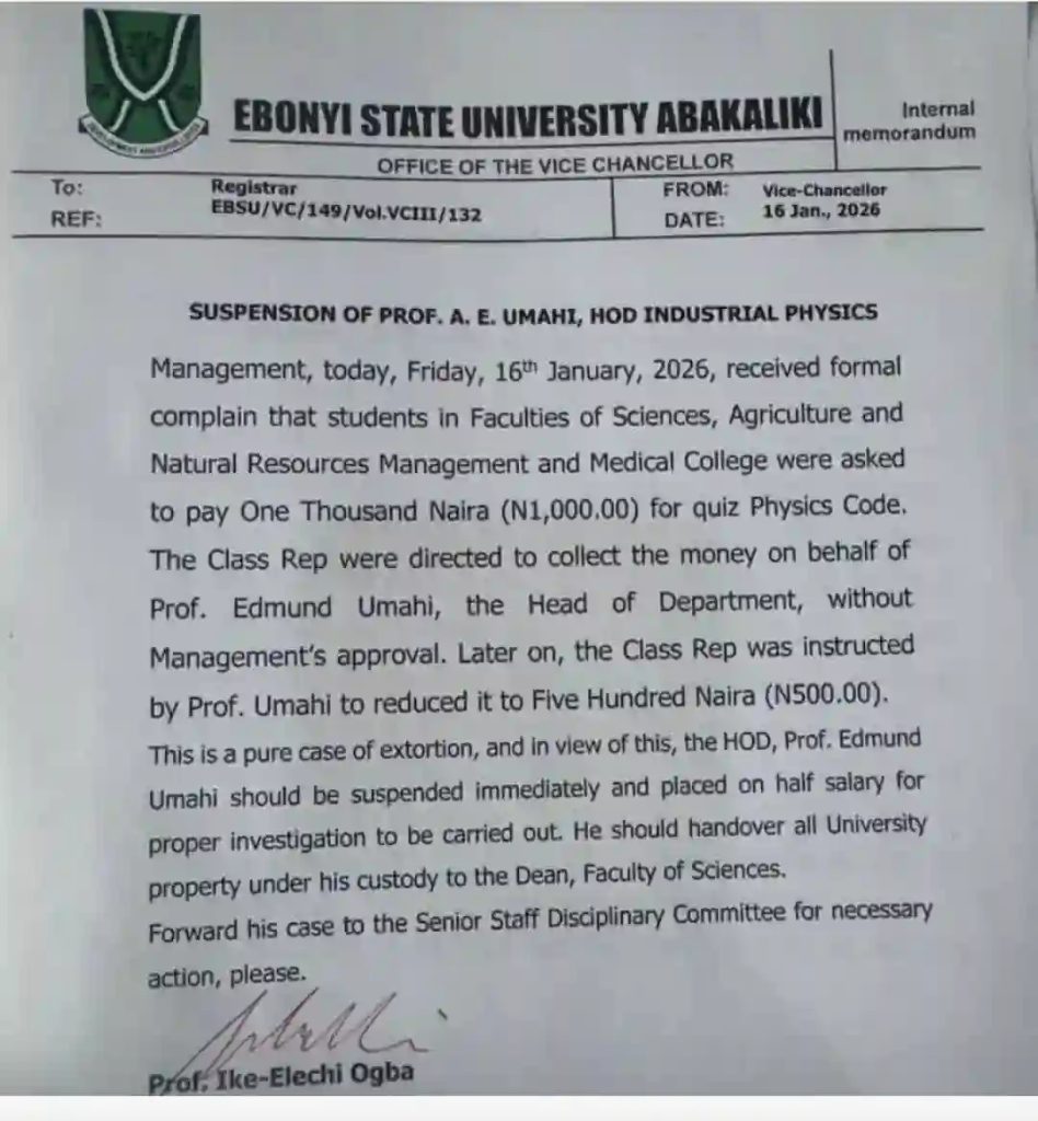 Ebonyi State University (EBSU) in Abakaliki has suspended Prof. Edmund Umahi, Head of the Department of Industrial Physics, amid allegations of extorting money from students. The incident, detailed in an internal memo dated January 16, 2026, highlights tensions over unauthorized fees in Nigerian higher education. University management acted swiftly, labeling the conduct as extortion and referring the matter for further investigation. ​