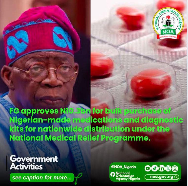 President Bola Ahmed Tinubu has approved ₦10.3 billion for the bulk purchase of Nigerian-made medications and diagnostic kits under the National Medical Relief Programme. This initiative, led by Health Minister Prof. Muhammad Ali Pate, aims to enhance healthcare access, boost local manufacturing, create jobs, and support vulnerable populations across all 774 local government areas.