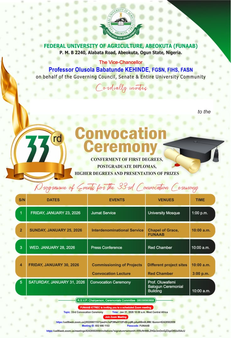 The Federal University of Agriculture, Abeokuta (FUNAAB), Africa’s leading University of Agriculture, has announced the programme of activities for its 33rd Convocation Ceremony, underscoring its enduring commitment to academic excellence, innovation, and national development.