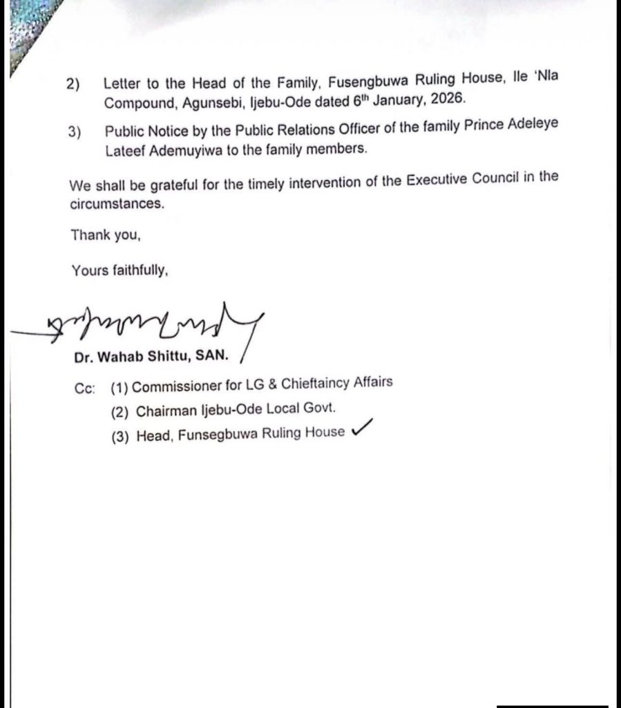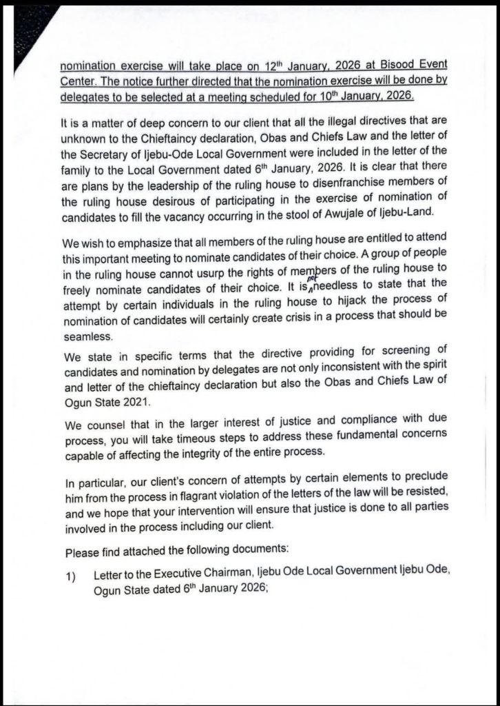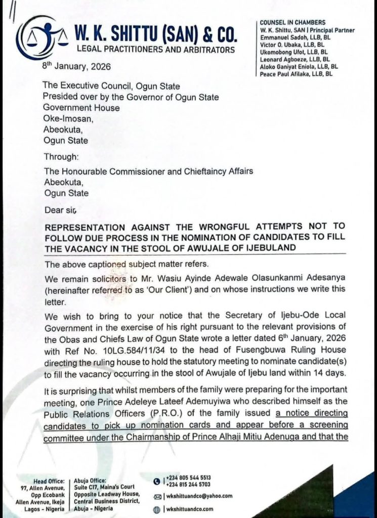 Addressed to the Ogun State Executive Council, the letter titled “Representation Against The Wrongful Attempts Not To Follow Due Process” highlights a January 6 directive from Ijebu-Ode Local Government Secretary (Ref: IOLG/584/11/34) for Fusengbuwa to nominate within 14 days. K1 faults a subsequent notice by Prince Adeleye Lateef Ademuyiwa, purportedly the family’s PRO, requiring candidates to collect forms and face a screening panel chaired by Prince Alhaji Mutiu Adenuga on January 12 at Bisrod Hall.