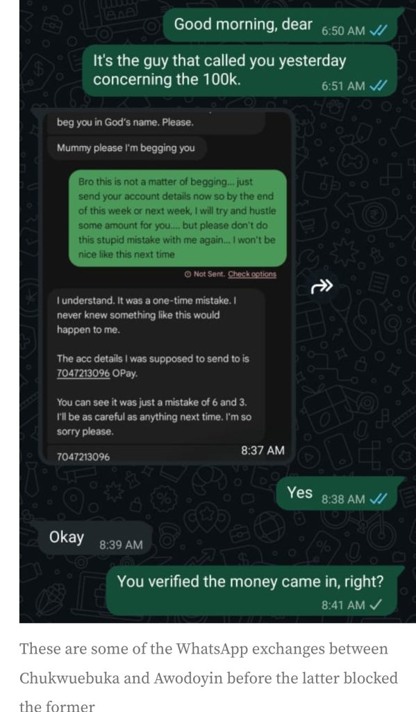 Despite this claim, further communication via WhatsApp seemed promising at first. Chukwuebuka noted that Awodoyin eventually agreed to a repayment plan in tranches. That hope was short-lived. By Wednesday morning, after Chukwuebuka sent a polite reminder, he discovered he had been blocked on all platforms.