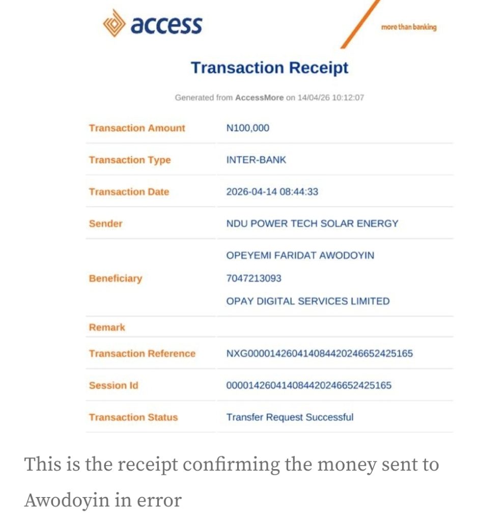 LAGOS – What was meant to be a routine loan repayment between friends has turned into a nightmare for Ani Gerald Chukwuebuka, a solar system installer and sales specialist based in Lagos. A single-digit error during a mobile transfer led to N100,000 landing in the OPay account of a stranger, Opeyemi Faridat Awodoyin, who has since allegedly blocked the sender to avoid refunding the money.