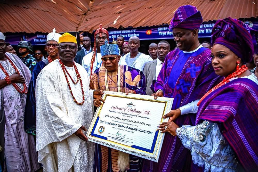 AKURE, ONDO STATE – Engineer Seyi Makinde, the Governor of Oyo State, and his wife, Mrs. Tamunominini Makinde, were on Friday, July 18, 2025, conferred with the prestigious chieftaincy titles of Aare Omoluabi and Yeye Aare Omoluabi of Akure Kingdom. The conferment was performed by His Imperial Majesty, Oba (Dr.) Aladetoyinbo Ogunlade Aladelusi CFR, the Deji of Akure Kingdom, as part of the monarch’s 10th anniversary celebrations on the throne.
