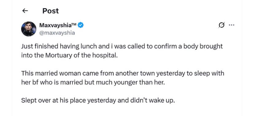 The story first surfaced on Twitter (X) through a medical doctor identified by the handle @Maxvaishai, who disclosed that he was called to a hospital mortuary to officially confirm the woman’s death.