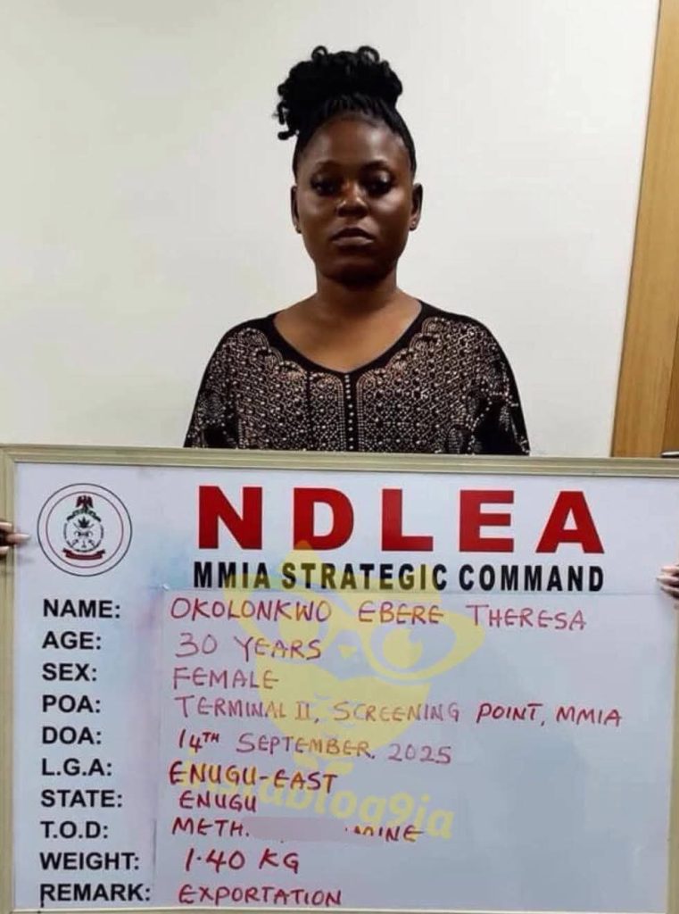Operatives of the National Drug Law Enforcement Agency (NDLEA) arrested a businesswoman, Okolonkwo Ebere Theresa, on Sunday, September 14, 2025, at the Murtala Muhammed International Airport, Lagos, for attempting to smuggle 1.40 kilograms of methamphetamine concealed in her underwear.