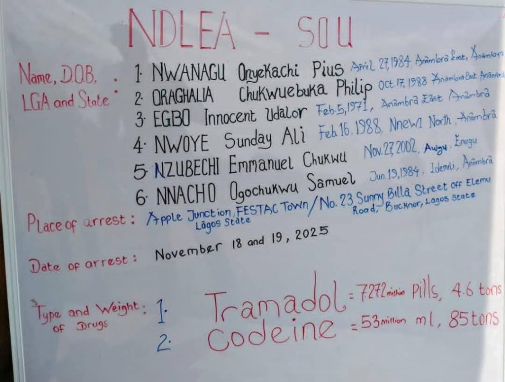 The operation, conducted between November 19th and 20th, 2025, was based on credible intelligence about the trafficking of more than 7.2 million tramadol 225mg pills and 526,200 bottles (52.6 million milliliters) of codeine syrup. Two syndicate members were first arrested in transit at Festac, Lagos, carrying 300 cartons of opioids, leading to the follow-up raid at the warehouse which saw the capture of the drug baron and his gang members.