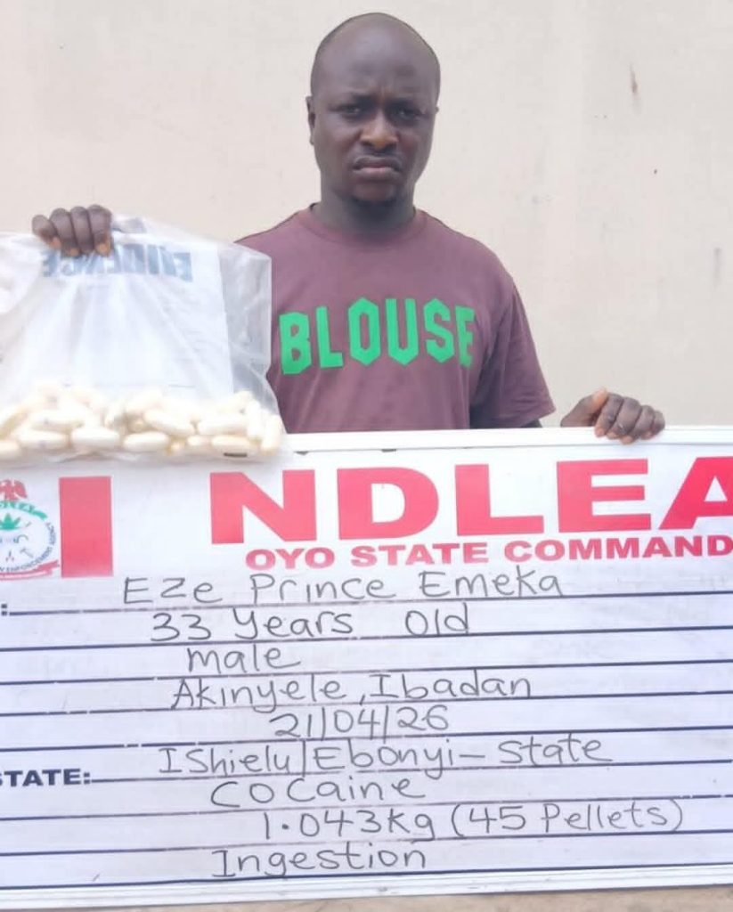 In a separate but equally dramatic arrest in Oyo State, 33-year-old Eze Prince Emeka was intercepted on an interstate bus heading to Sokoto. After a body scan confirmed he had ingested illicit substances, Emeka was placed under “excretion observation,” where he eventually expelled 45 pellets of cocaine weighing 1.043kg.