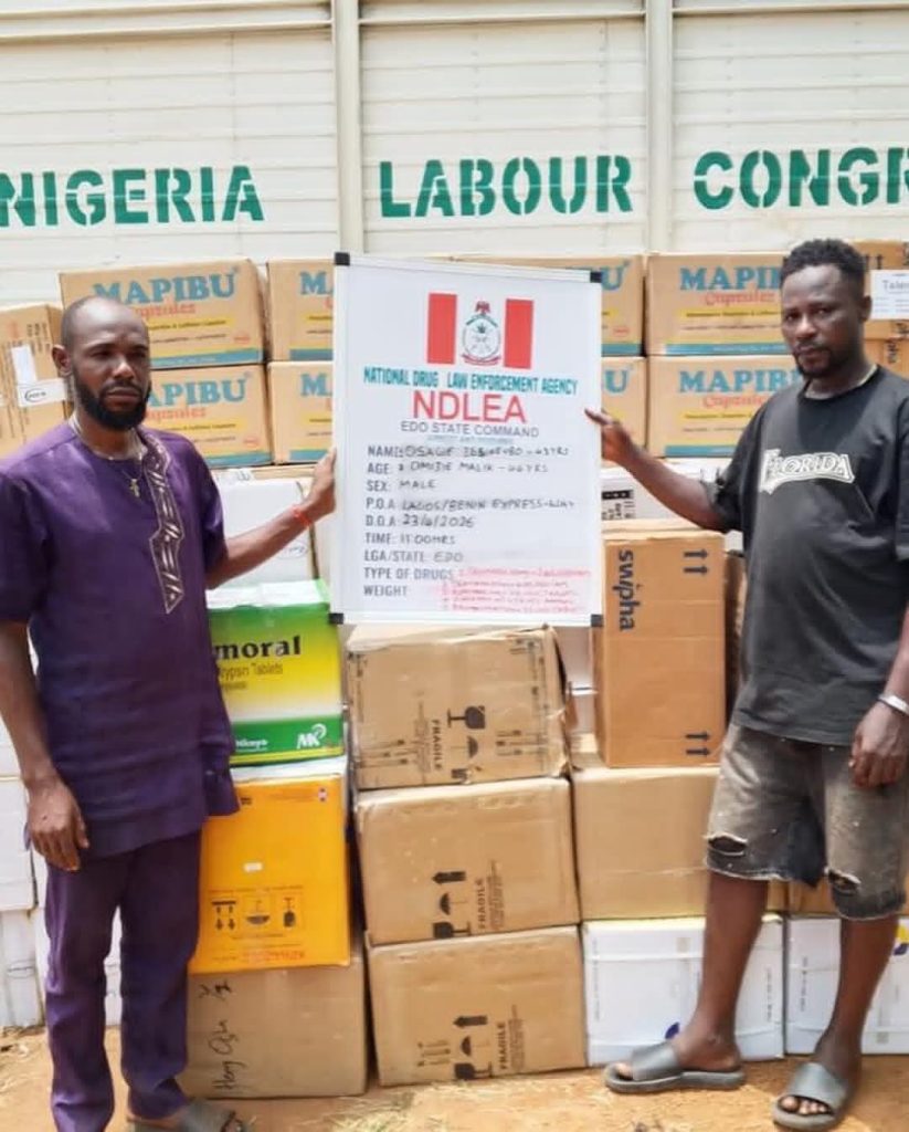 2.Edo State: A truck marked NLC 146 FC was intercepted along the Benin/Lagos expressway carrying 1,196,000 pills of pharmaceutical opioids heading to Onitsha, Anambra State. Two suspects, Osagie Igbinibo (43) and Omijie Malik (44), were apprehended.