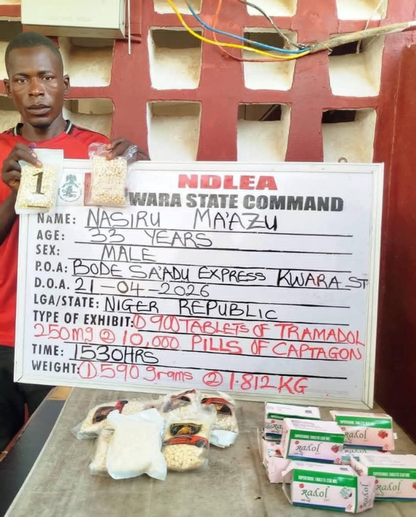 In a landmark operation on Tuesday, April 21, 2026, operatives along the Bode Saadu road in Kwara State intercepted a trailer conveying passengers. A search led to the arrest of 33-year-old Nasiru Mu’azu, who was found with 10,000 pills of Captagon and nine packets of Tapentadol.