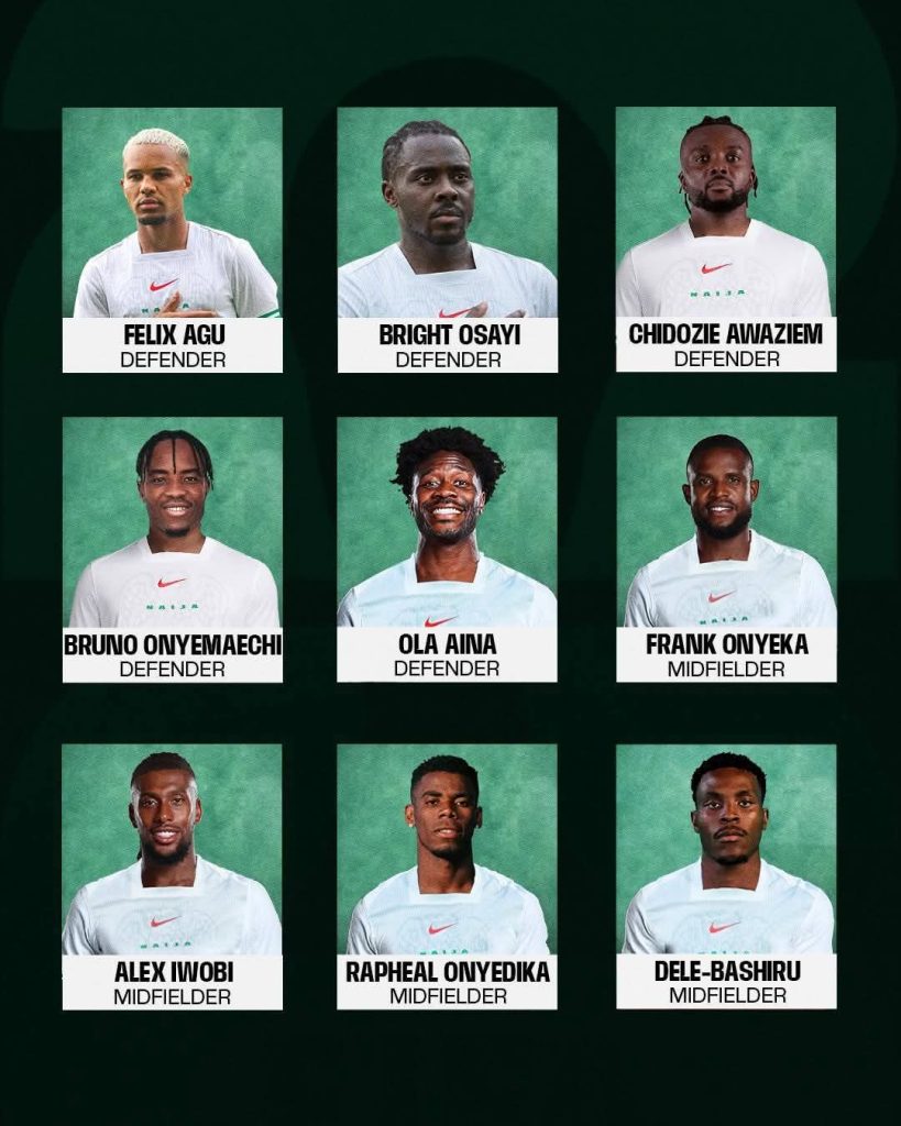 2.Defenders: William Ekong (Al-Kholood, Saudi Arabia), Calvin Bassey (Fulham FC, England), Olaoluwa Aina (Nottingham Forest, England), Bright Osayi-Samuel (Birmingham City, England), Bruno Onyemaechi (Olympiakos, Greece), Chidozie Awaziem (Nantes FC, France), Felix Agu (Werder Bremen, Germany), Benjamin Fredericks (Dender FC, Belgium)
