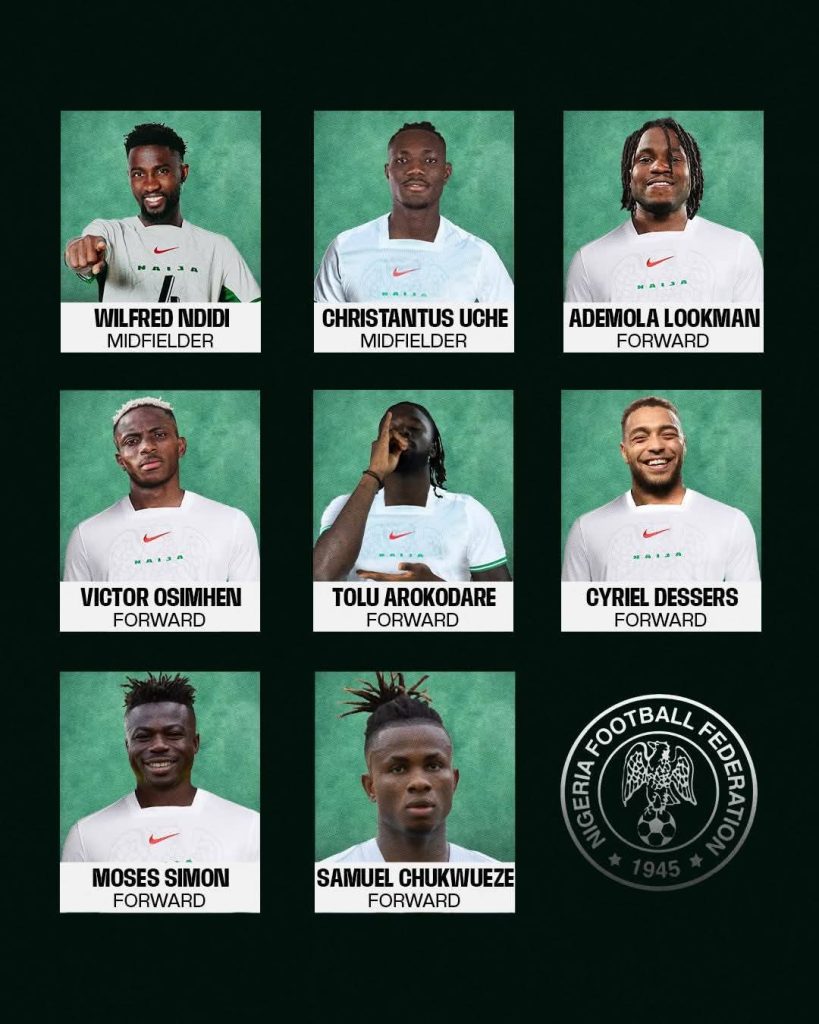 4.Forwards: Ademola Lookman (Atalanta BC, Italy), Samuel Chukwueze (AC Milan, Italy), Victor Osimhen (Galatasaray FC, Turkey), Simon Moses (Paris FC, France), Cyriel Dessers (Glasgow Rangers, Scotland), Tolu Arokodare (KRC Genk, Belgium)