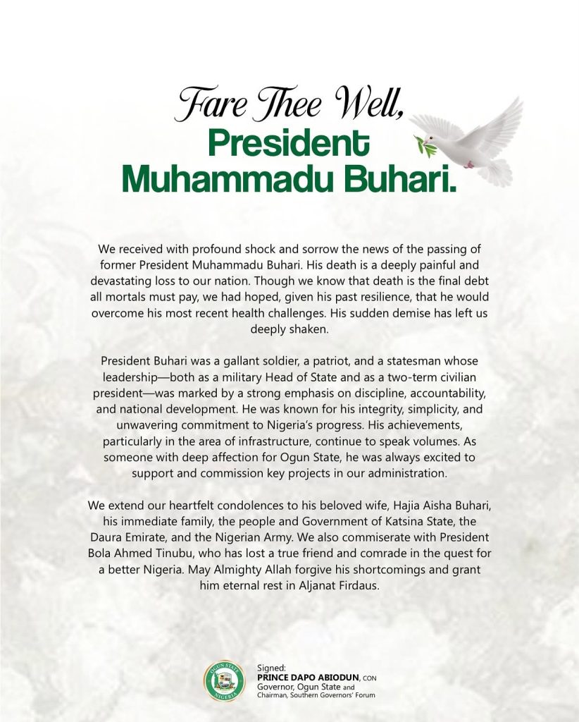 The Ogun State Government expresses profound shock and deep sorrow at the passing of former President Muhammadu Buhari, describing his death as a painful and devastating loss to Nigeria. Despite his well-known resilience and previous recoveries from health challenges, the news of his sudden demise has left the government and people of Ogun State deeply shaken.