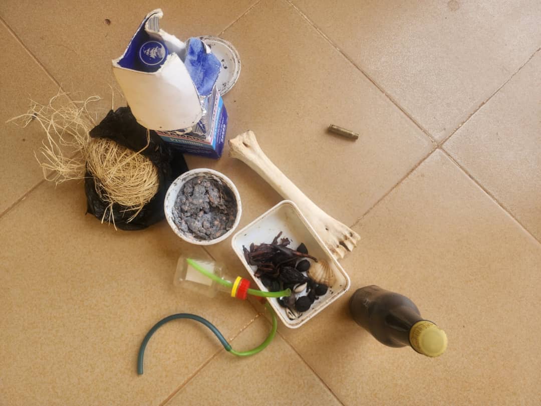 The police spokesman added, “These include a piece of bone suspected to be human skeletal remains, which will be subjected to forensic analysis, two native sponges, fetish charms, black soap, and one expended shell of AK-47 ammunition.”
