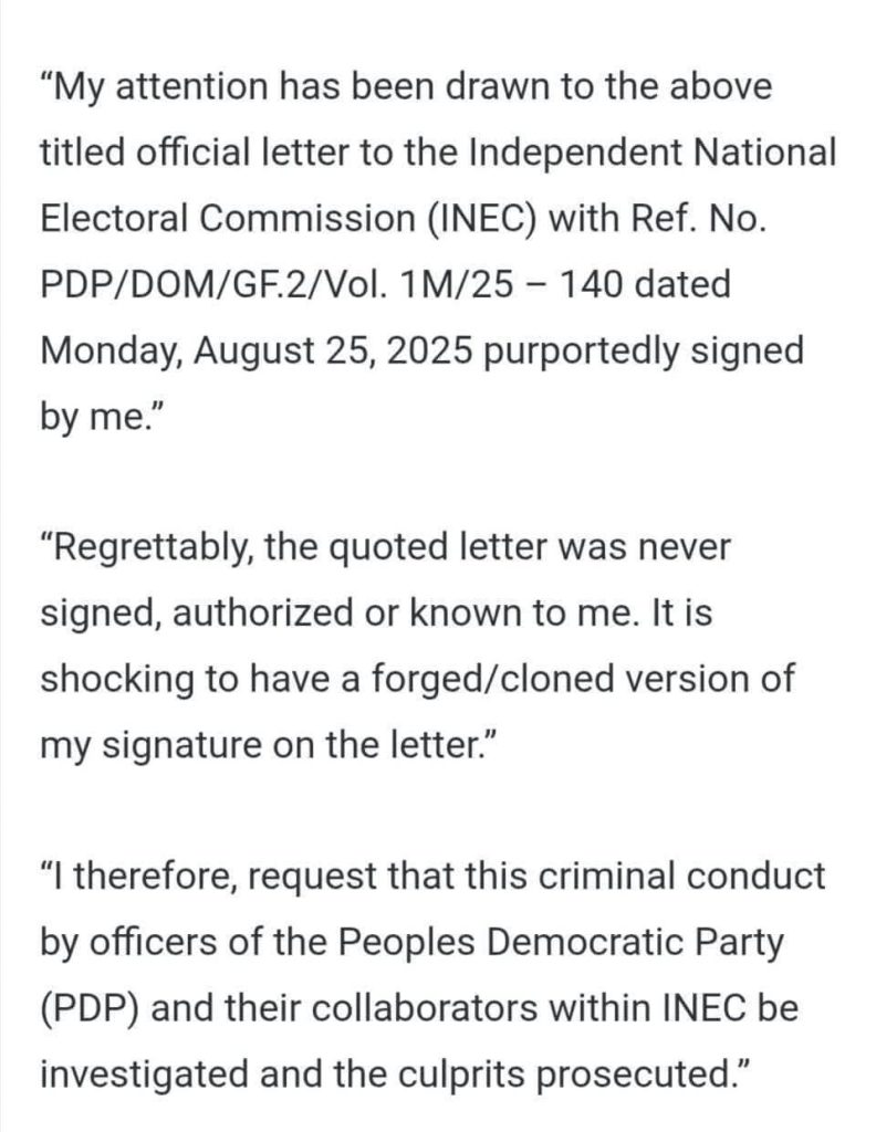 In a formal letter addressed to the Acting Chairman of INEC, Anyanwu dismissed the validity of the document, clarifying that he neither signed nor authorized the letter. He expressed shock at discovering a forged or cloned version of his signature on the official communication and called for a thorough investigation into what he described as a criminal act. Anyanwu called on the Department of State Services (DSS), the Nigeria Police Force, and INEC to investigate the collusion he alleges between some PDP officials and elements within INEC, urging prosecution of those responsible.