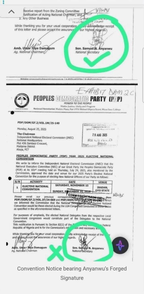 The political landscape of the People’s Democratic Party (PDP) is currently marked by controversy as Senator Samuel Anyanwu, the party’s National Secretary, has publicly alleged forgery of his signature on an official letter sent to the Independent National Electoral Commission (INEC). The letter, dated August 25, 2025, and referenced PDP/DOM/GF.2/Vol. 1M/25-140, pertains to the PDP’s 2025 elective national convention and was purportedly co-signed by Anyanwu and the Acting National Chairman, Ambassador Iliya Umar Damagum.