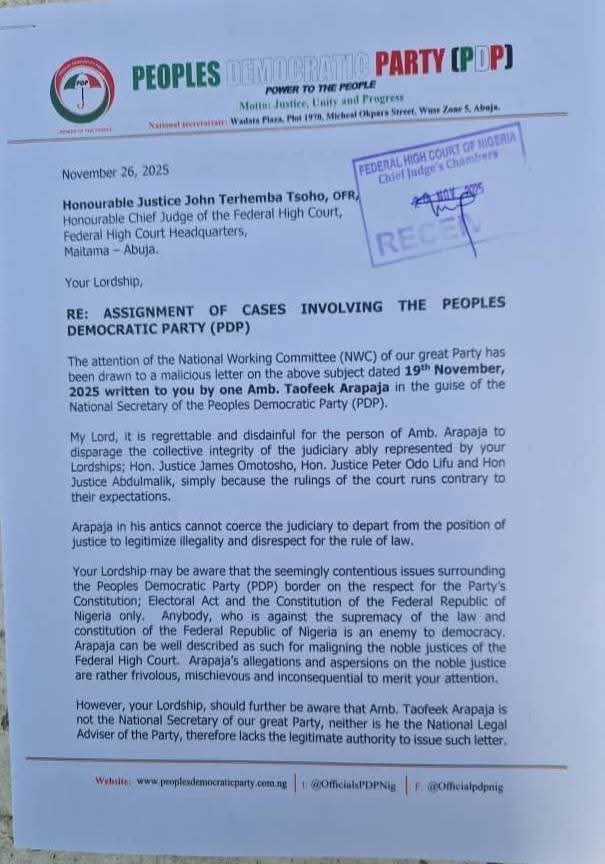 The controversy escalated following a letter dated November 19, 2025, allegedly authored by Amb. Arapaja and presented to the Honourable Chief Judge of the Federal High Court. In this letter, Arapaja purported to hold the office of National Secretary and made disparaging remarks against some Federal High Court judges. The PDP’s National Working Committee described the letter as “regrettable and disdainful,” stressing that it was written without any mandate or authority from the party.
