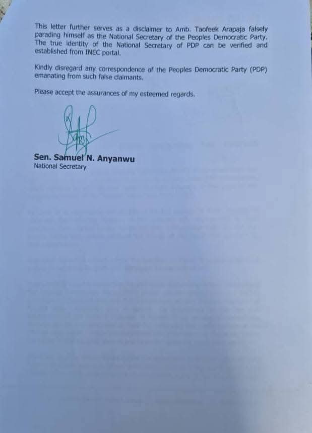 The official PDP letter stated, “Amb. Taofeek Arapaja is neither the National Secretary nor the National Legal Adviser of the Peoples Democratic Party. As such, he lacks any legitimate authority to issue correspondence or represent the party in any official capacity.” The party further instructed all stakeholders—including government agencies, INEC, and judicial authorities—to entirely disregard any communications attributed to Arapaja.