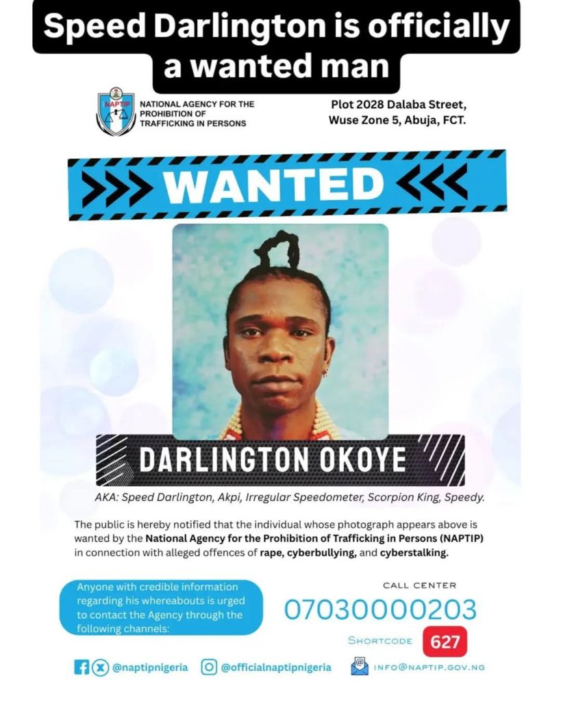 The National Agency for the Prohibition of Trafficking in Persons (NAPTIP) has declared Nigerian entertainer Darlington Okoye, known as Speed Darlington, wanted over allegations of rape, cyberbullying, and cyberstalking. This announcement came after Speed Darlington failed to respond to multiple summons for questioning related to a viral Instagram Live video in which he claimed to have had sexual intercourse with a 15-year-old girl.