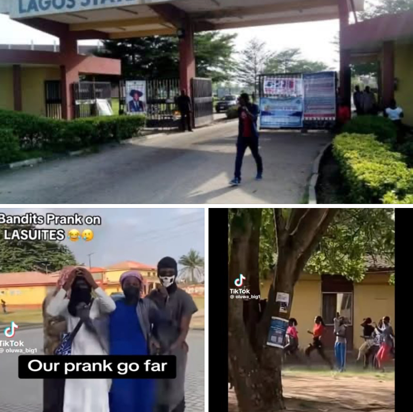 The Lagos State University community has reacted angrily to a viral prank video in which a group of young men dressed in costumes resembling extremist fighters stormed the campus, causing panic among students.