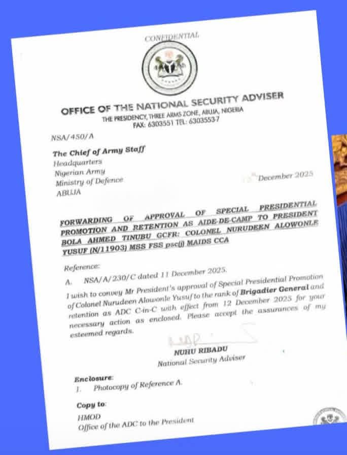 The letter, which surfaced publicly on the same day it was issued, reads in part: “I wish to convey Mr. President’s approval of Special Presidential Promotion of Colonel Nurudeen Alowonle Yusuf to the rank of Brigadier General and retention as ADC C-in-C with effect from 12 December 2025 for your necessary action as enclosed. Please accept the assurances of my esteemed regards.” This move has ignited widespread debate, with critics labeling it a “double promotion” that bypasses standard Nigerian Army protocols.