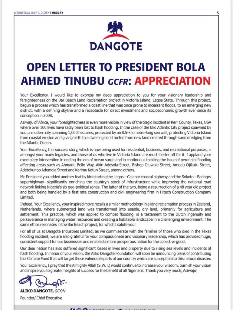 Lagos, Nigeria – In a powerful commendation, Alhaji Aliko Dangote, Chairman of Dangote Industries Limited, has lauded President Bola Ahmed Tinubu for his “visionary leadership and farsightedness” in critical infrastructure projects, drawing a stark contrast with the recent tragic flash floods in Kerr County, Texas, USA. Dangote’s appreciation, conveyed in a letter, highlights the President’s impactful legacy in transforming Nigeria’s landscape and bolstering its resilience against environmental threats.