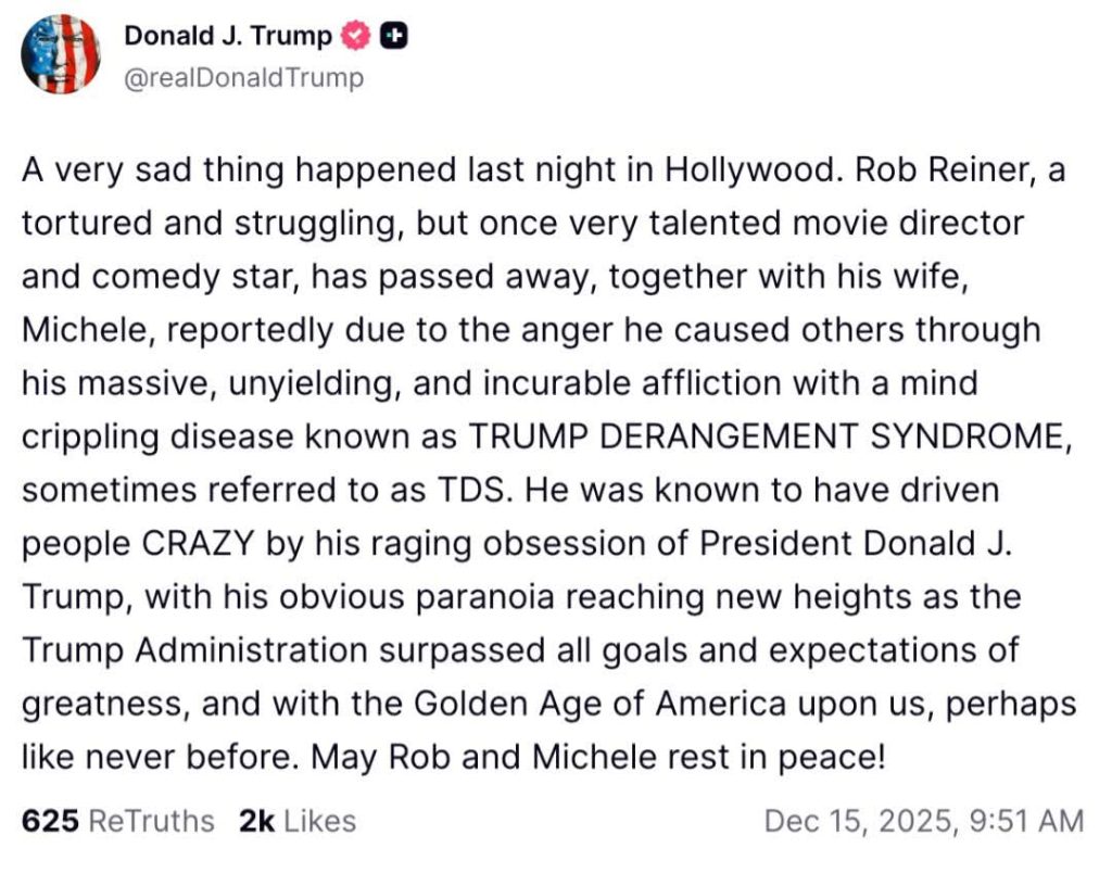 Trump’s post on Truth Social, shared hours after the news broke, read: “A very sad thing happened last night in Hollywood. Rob Reiner, a tortured and struggling, but once very talented movie director and comedy star, has passed away, together with his wife, Michele, reportedly due to the anger he caused others through his massive, unyielding, and incurable affliction with a mind crippling disease known as TRUMP DERANGEMENT SYNDROME, sometimes referred to as TDS. He was known to have driven people CRAZY by his raging obsession of President Donald J. Trump, with his obvious paranoia reaching new heights as the Trump Administration surpassed all goals and expectations of greatness, and with the Golden Age of America upon us, perhaps like never before. May Rob and Michele rest in peace!”