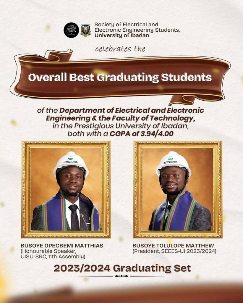 In a remarkable display of academic prowess, twin brothers have made their family and the University of Ibadan proud by bagging first-class degrees with an impressive CGPA of 3.94/4.00. This outstanding achievement is a testament to their hard work, dedication, and passion for learning.